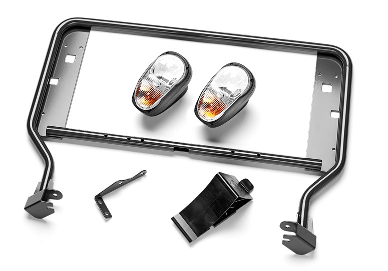Koplampenset voor de voorzijde wanneer de rolbeugel (ROPS) gemonteerd is, koplampen met knipperlichten en speciaal frame waar de koplampen draaibaar in te monteren zijn.