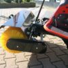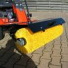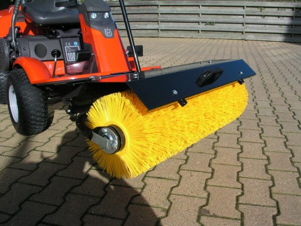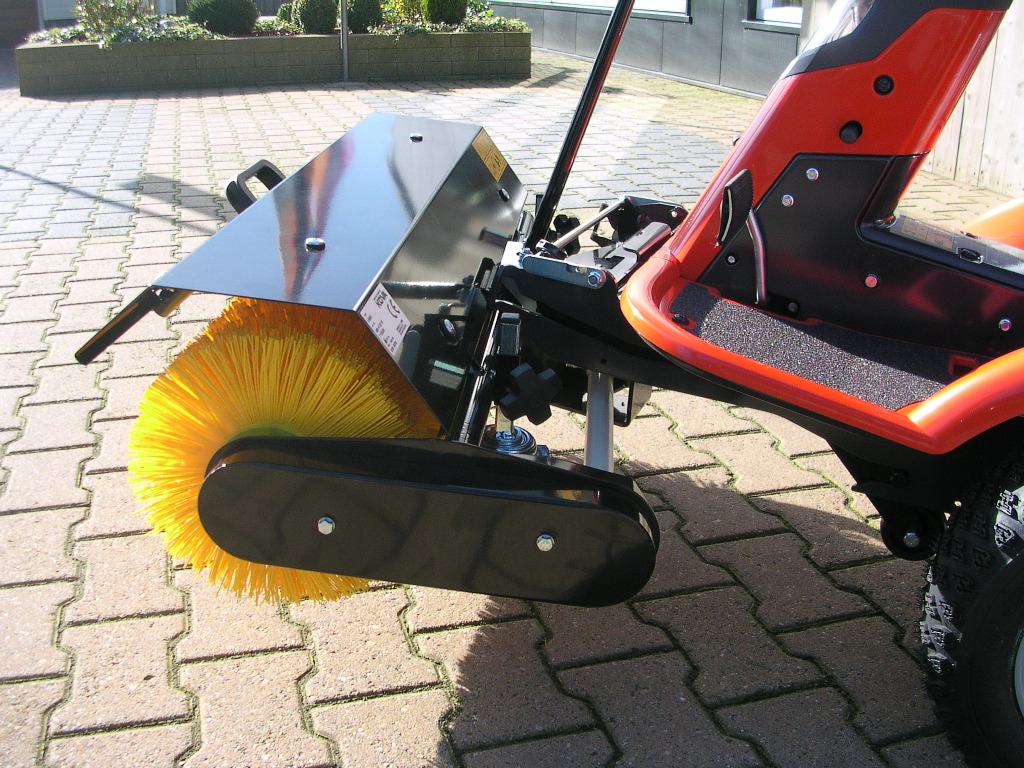 Veegmachine voor aanbouw aan Husqvarna Rider frontmaaier, schuin te stellen, borstel diameter 350 mm, werkbreedte 105cm, afstelbare zenkwielen aan de achterzijde. Veegmachine past aan snelkoppelingssysteem voor frontaanbouw.