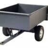 Universele kiepende trailer met stalen bak, zwaar model met bredere banden en uitneembaar achterschot, past aan nagenoeg elke zitmaaier met trekhaak.